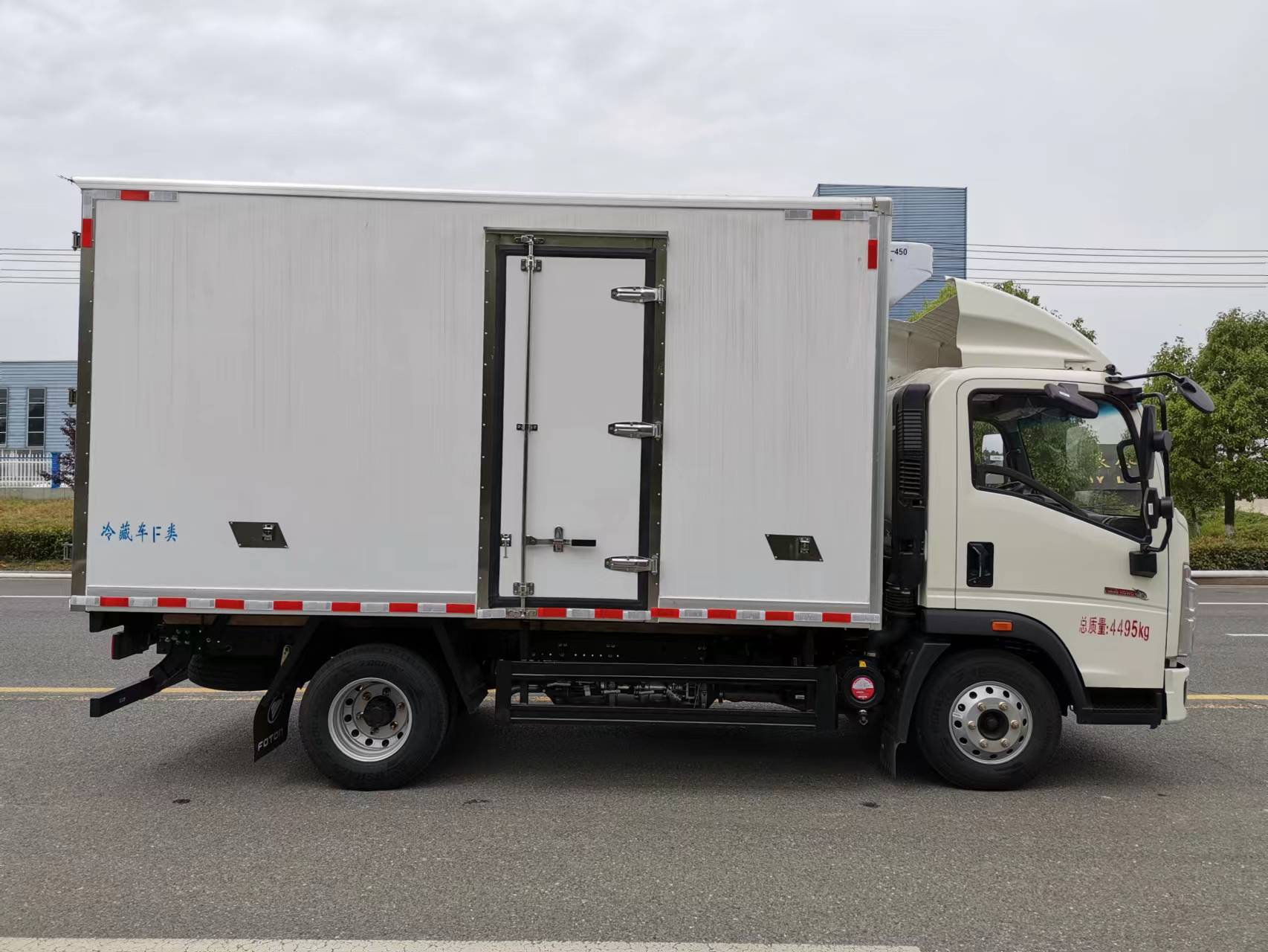 福田H2冷藏車采用全柴115馬力(Q23-115C60發動機,萬里揚5變速箱,NPR沖壓后橋(帶制動襯片磨損報警),7.00R16輪胎,斷氣剎、單排翻轉、車載無線服務控制器(T-BOX)、ABS、離合助力、動轉,