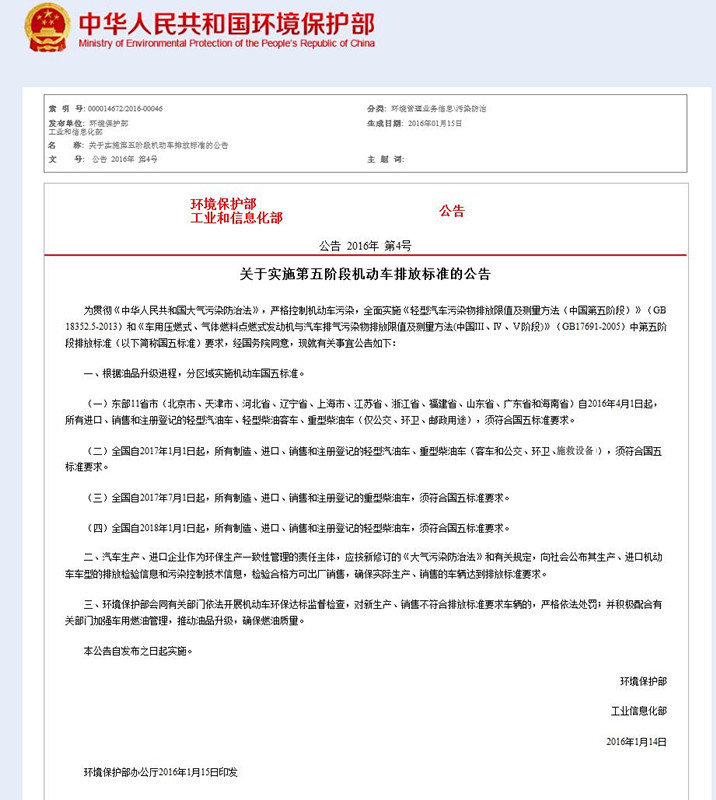 (二)全國自2017年1月1日起,所有制造、進(jìn)口、銷售和注冊(cè)登記的輕型汽油車、重型柴油車(客車和公交、環(huán)衛(wèi)、郵政用途),須符合國五標(biāo)準(zhǔn)要求。