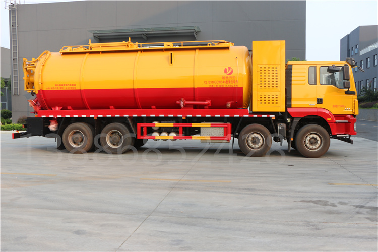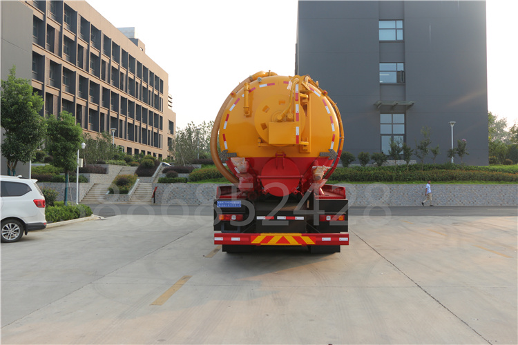 該車用于清洗吸污,主要專用裝置為罐體及清洗吸污裝置;罐體尺寸為(直段長×直徑)(mm):7100×2350(前部3150mm為清水罐,后部3950mm為污水罐);污水罐有效容積14.57立方米,介質:液態污物,密度:800千克/立方米;清水罐有效容積11.66立方米,介質:,密度:1000千克/立方米,兩罐獨立,且不能同時滿載,清洗功能時用清水罐,吸污功能時用污水罐;隨底盤選裝駕駛室,選裝罐體側部樣式及后部樣式;卸料方式為舉升后卸式;側、后防護材料均為Q235,連接方式:螺栓連接。后防護截面尺寸(mm)200×60,下邊緣離地高480mm;ABS系統生產廠家及型號分別為:西安正昌電子股份有限公司(型號:ZQFB-V),廣州瑞立科密汽車電子股份有限公司(CM4XL-4S/4M)。選裝前部不帶卷簾門保護箱。
