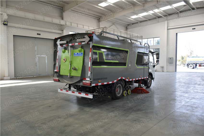 東風福瑞卡洗掃車_國六5.5方洗掃車_物業小區洗掃車_藍牌柴油清掃車,該車主要作用于路面的清掃作業;專用裝置為清掃裝置、垃圾箱。ABS型號/廠家:ABS/ASR-12V-4S/4M/襄陽東風隆誠機械有限責任公司;側防護裝置為專用裝置代替,后防護材料均為:Q235碳鋼,連接方式為:螺栓連接,后部防護截面尺寸(mm):120×50,后部防護離地高度(mm):370.隨底盤選裝駕駛室。選裝燃油箱,電瓶,尿素罐,儲氣筒左右安裝位置。