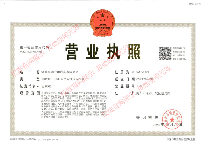公司地址:湖北省隨州市高新區鐵北產業園文化公園北路57號 湖北盈通專用汽車有限公司