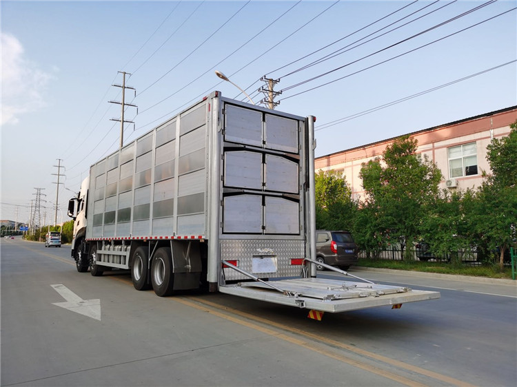 1.廂體鋁合金制作:地面防滑,內部地板以及頂部天花板升降可翻起,方便沖洗;廂體型材采用高強度鋁合金型材,地板防滑花紋板,翻板厚度40mm,頂板為蜂窩保溫板,底盤副大梁為熱鍍鋅鋼材質;