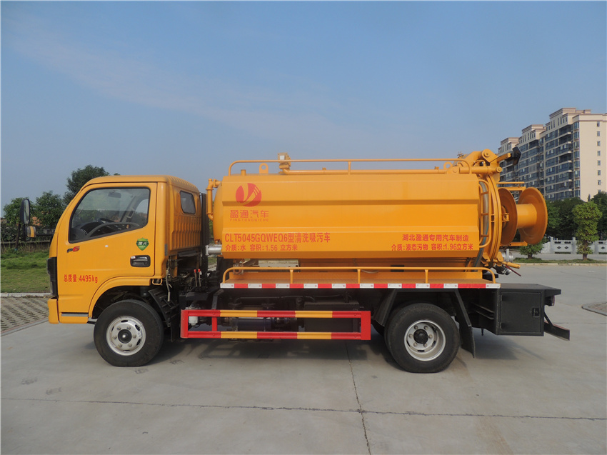 該車用于下水道排污及疏通,專用裝置:罐體及清洗吸污裝置;罐體外形尺寸(直段長×直徑)(mm):3100×1300(前部1300mm為清水罐,后部1800mm為污水罐);污水罐總容量:2.1立方米,污水罐有效容積:2.0立方米,介質:液態污物,密度800千克/立方米;清水罐總容量:1.68立方米,清水罐有效容積:1.6立方米,介質:,密度1000千克/立方米,清水罐和污水罐為獨立罐體,清洗功能時用清水罐,吸污功能時用污水罐,污水罐和清水罐不可同時滿載;ABS型號/廠家:ABS/ASR-12V-4S/4M/襄陽東風隆誠機械有限責任公司;卸料方式為舉升后卸式;側、后防護材料均為:Q235碳鋼,連接方式均為:螺栓連接,后部防護截面尺寸(mm):120×50,后部防護離地高度(mm):370.隨底盤選裝駕駛室,選裝底盤附件安裝位置.選裝燃油箱,電瓶,尿素罐,儲氣筒左右安裝位置