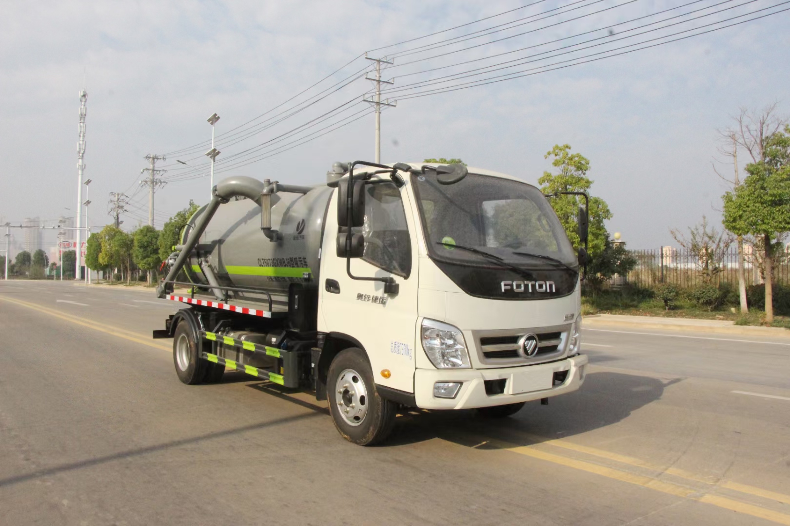 福田5方吸污車,奧鈴5方吸污車,抽排運污車,糞便液態吸糞車,泥漿液態轉運車,該車用于吸除水坑、下水道里污濁物;主要裝置有罐體及吸污裝置.該車具有舉升功能.罐體總容量:4.1立方米;罐體有效容積:3.9立方米;罐體外形尺寸(總長×直徑)(mm):3800×1300.側、后防護材料均為:Q235碳鋼,連接方式均采用螺栓連接,后部防護截面尺寸(mm):120×50,后部防護離地高度(mm):400.ABS系統型號:ABS-E;生產企業:威伯科汽車控制系統(中國)有限公司.ABS系統型號:ABS-VI.E;生產企業:廣州瑞立科密汽車電子股份有限公司.僅采用底盤3360mm軸距改裝.隨底盤選裝駕駛室.